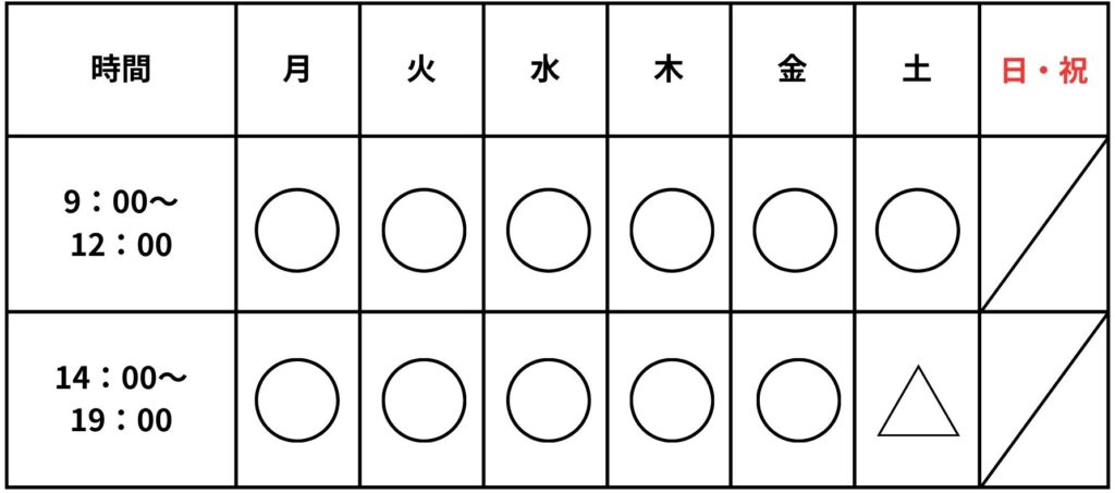⚠️:土曜日午後は13時30分から最終受付17時30分